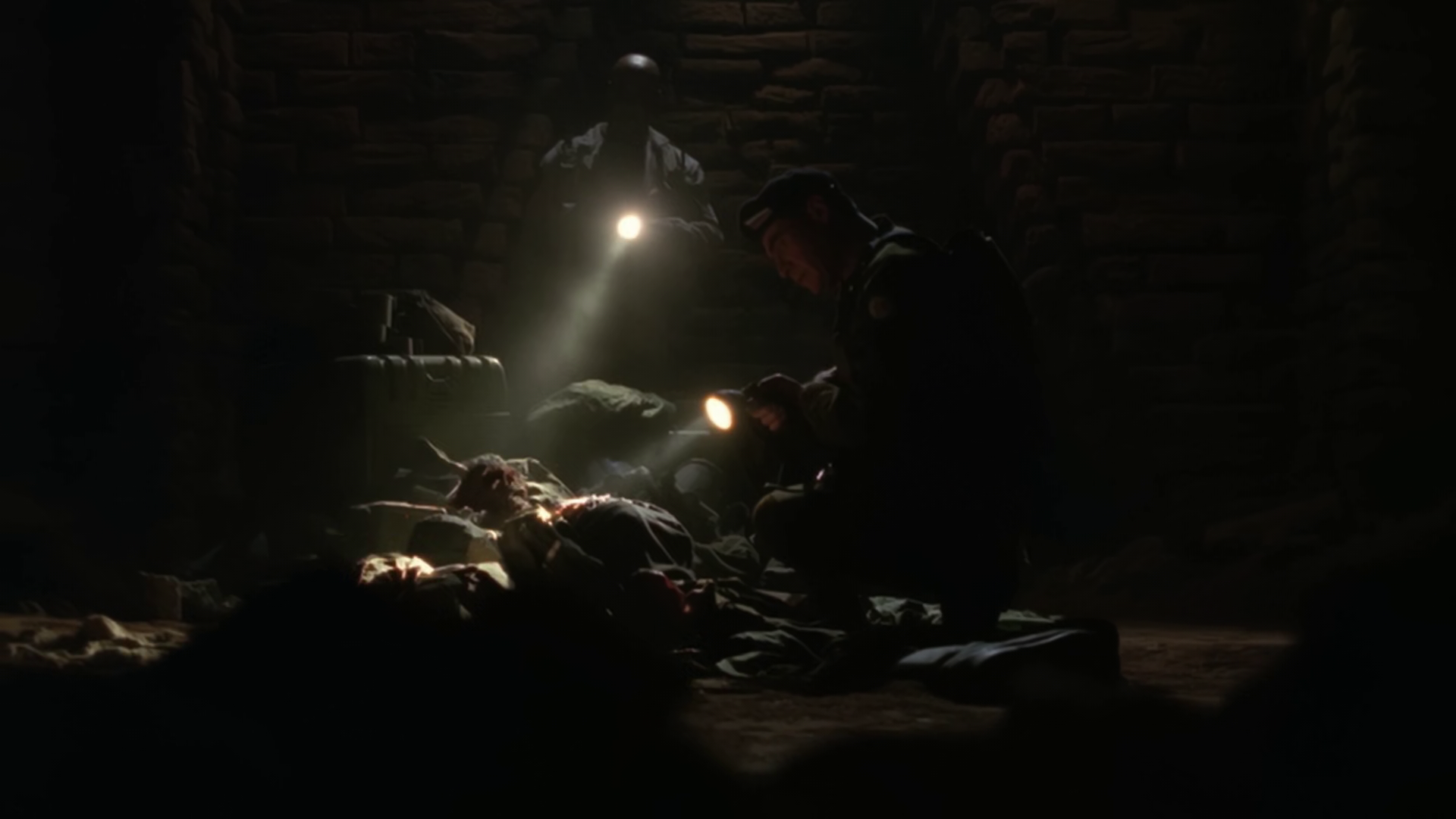 Zukhov and Teal’c find the remaining Russian team members, also all dead. They find a log book and head off, although Zukhov sneaks the Eye of Tiamat into one of his pouches while Teal’c isn’t looking. Carter and Tolinev spot a cocoon and then spot the creature. It attacks them, but they shoot at it. Tolinev gets hit, but Sam manages to hit it. They head to the main chamber and Sam says that she felt the presence of a Gou’ald in the creature. Which means all this elaborate punishment for Marduk was inflicted on the innocent human host instead.