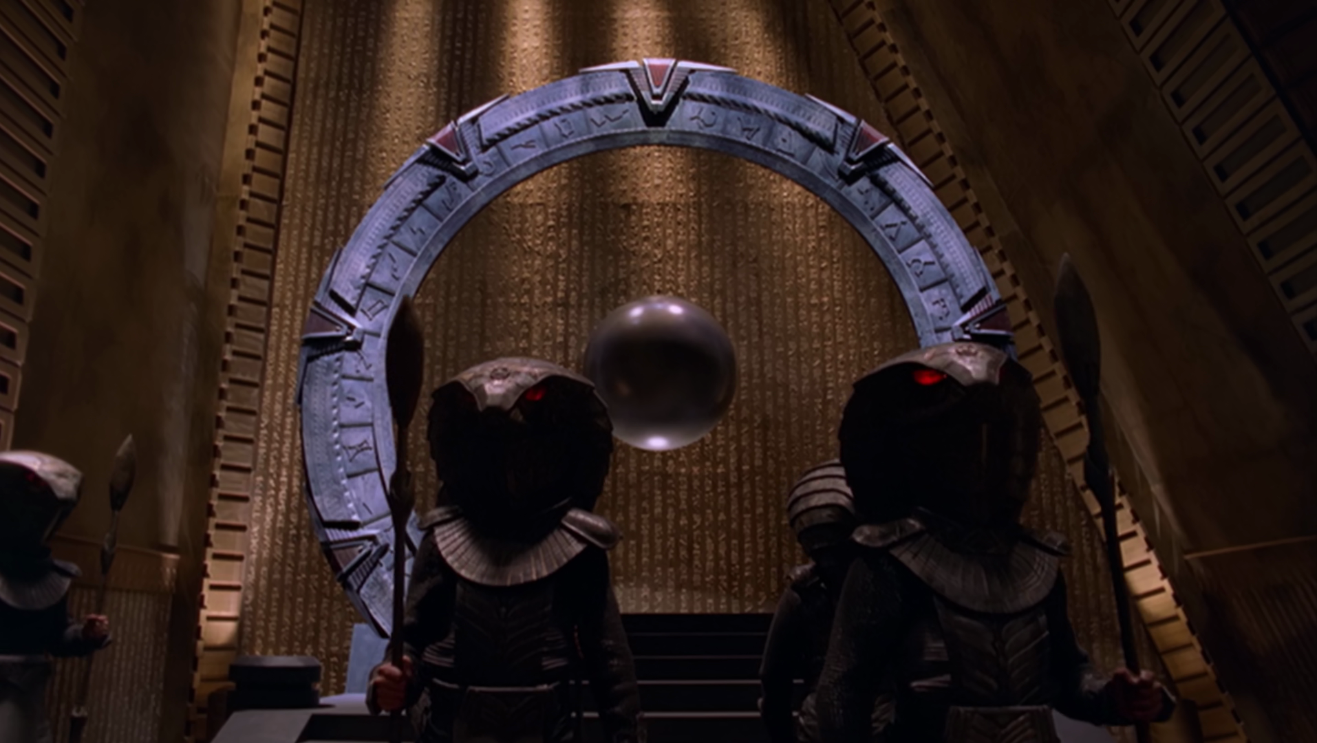 What this turns out to be as Jaffa enter the room, forcing SG-1 to hide. They install a strange orb into the stargate (which stopped working after the room vibrated). SG-1 sneak around and find a room with a window and sarcophagus, noticing that they’re on a ship and moving – Teal’c says the ships can move at 10 times the speed of light, which Carter works out means it will take a year to reach a year to reach Earth.