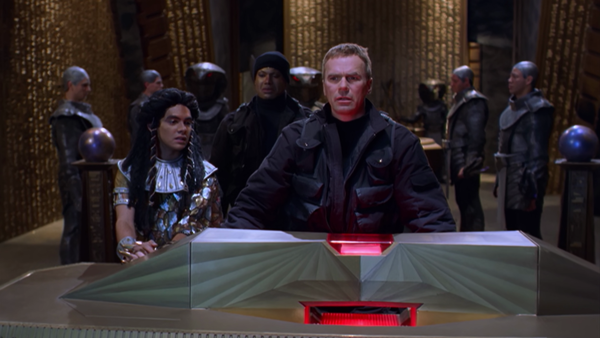Right after the events of Politics, Hammond attempts to get the President to overrule Senator Kinsey’s orders. The president, while supporting the Stargate program, says it would be political suicide to go against him. Better to risk the destruction of the Earth than to risk your career, I guess. SG-1 do exactly as you’d expect: they lock the doors (as everyone is away and tidying up, a bit too convenient but possibly planned by Hammond) and head to the coordinates Daniel found in the alternative reality.