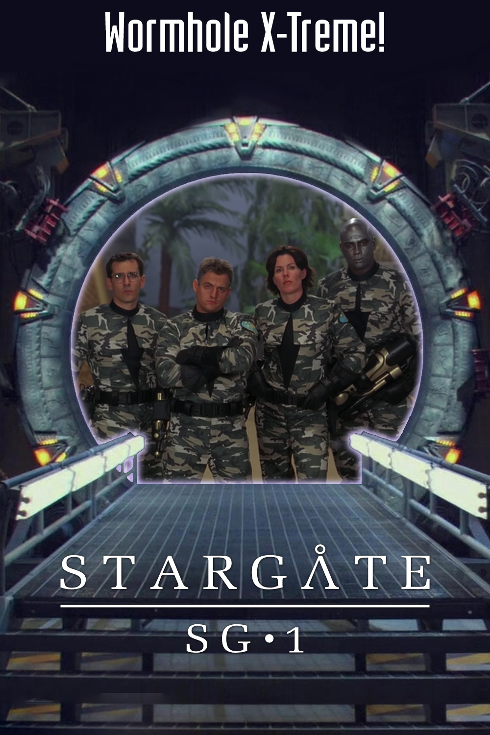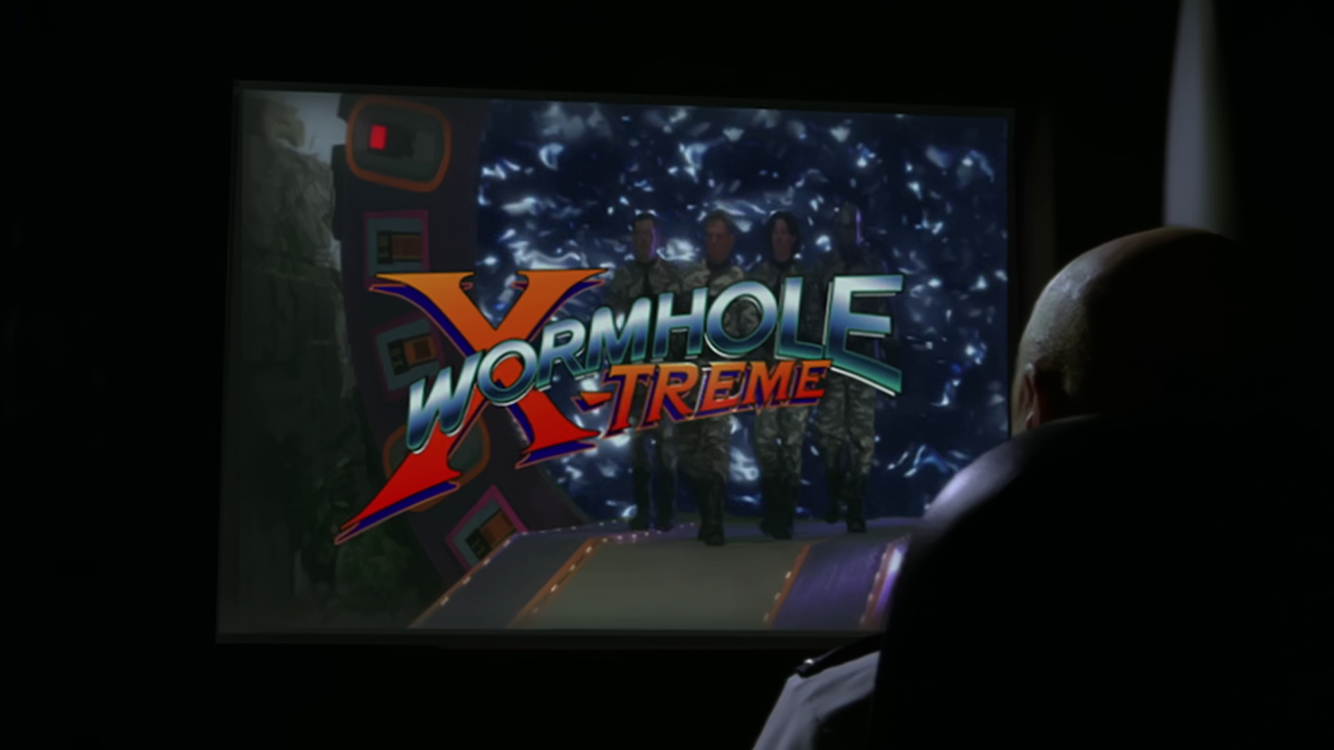 We see the opening titles to this show – called Wormhole X-Treme! – with SG-1 reacting to the show version of themselves, with Teal’c’s counterpart being a robot. Hammond explains that Martin sold the show to the studio, and that the Air Force is fine with its existence as they could have stopped it – this show could help cover up any potential leaks. Hammond has had Jack assigned as the show’s military consultant.