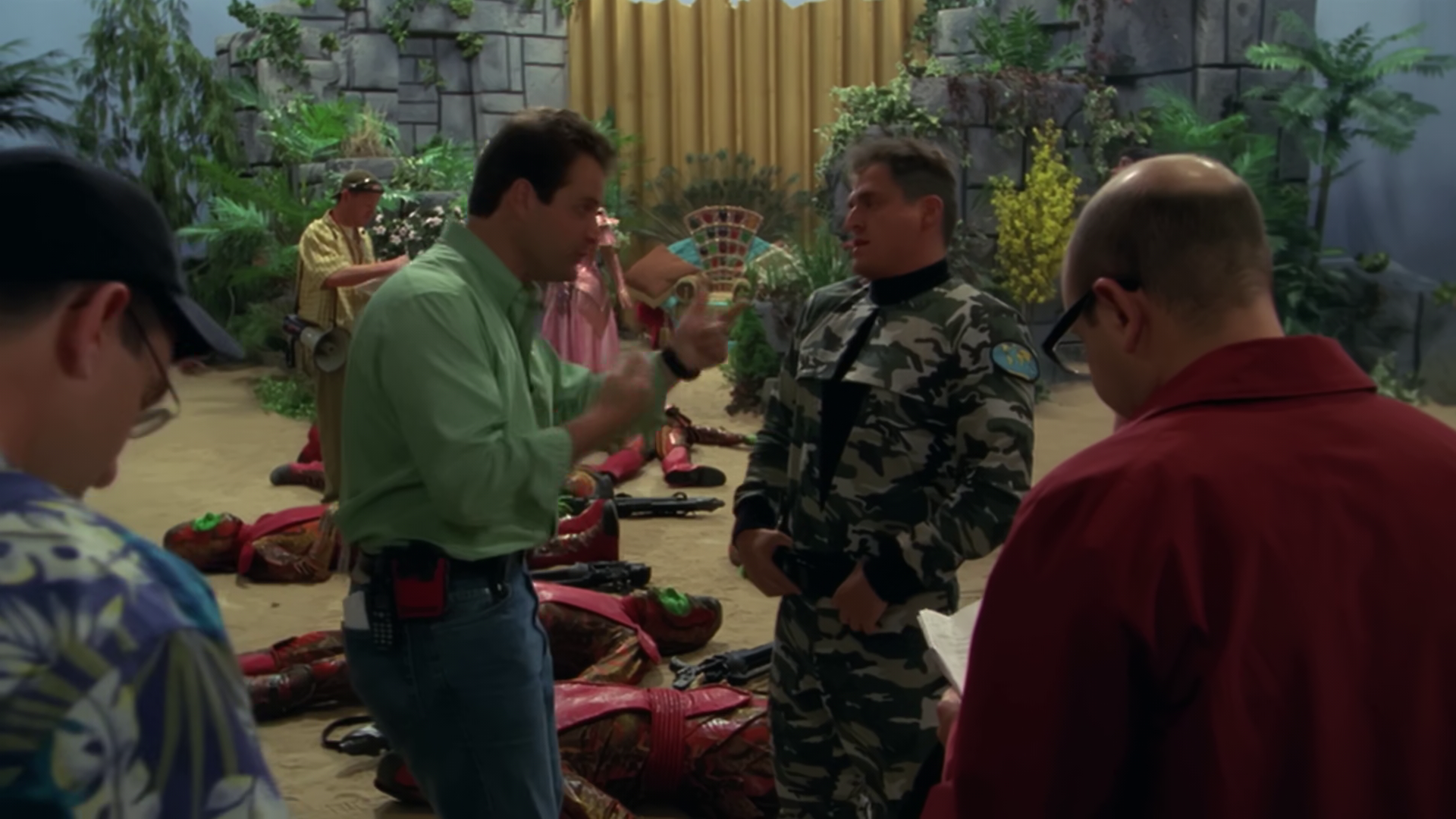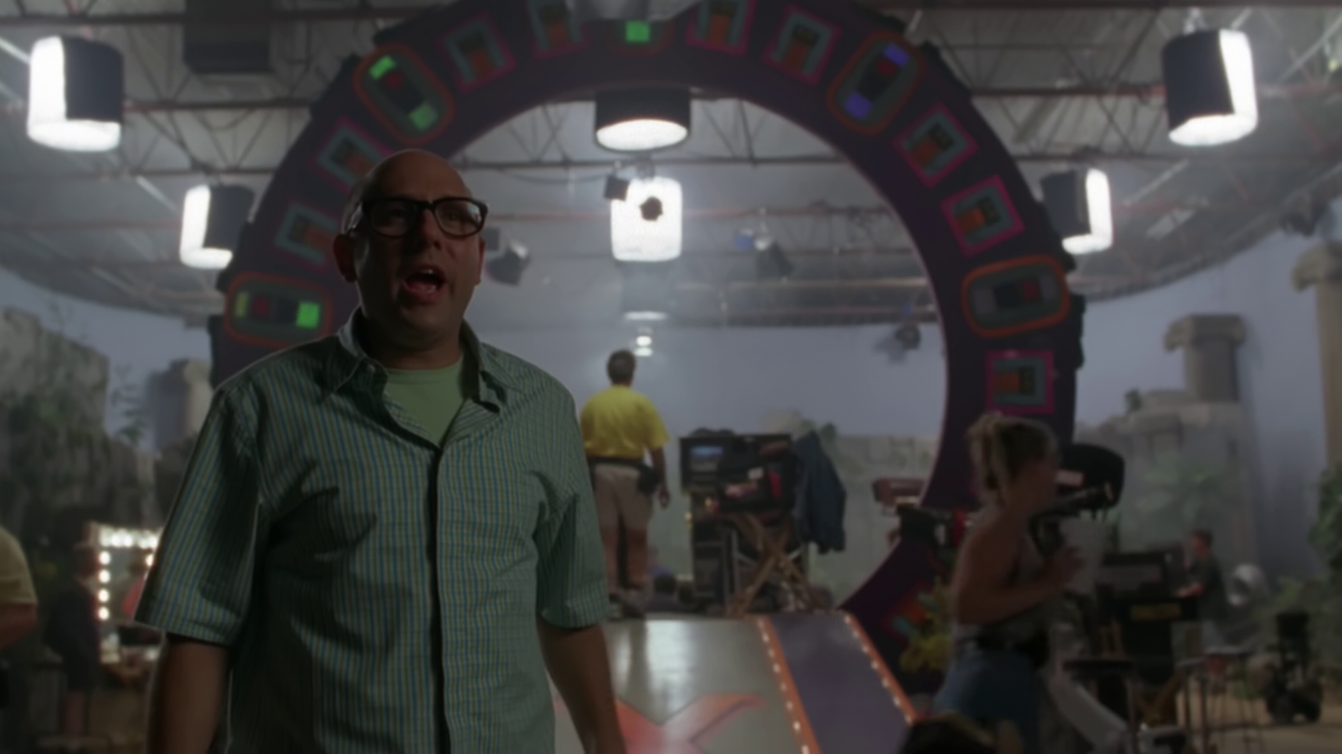 On the set, the lead actor is complaining about a romantic scene. The dialogue is all nice, but there are dead bodies littered around everywhere. The director argues that there’s no other sets, so they can’t be somewhere else, and that the initial script was wrong because the first shot stuns and the second shot kills. Martin points out that the third shot disintegrates, but the director tells him that that is a stupid idea (Stargate itself hasn’t used it for a while). Eventually, the director caves in and the extras are sent off.