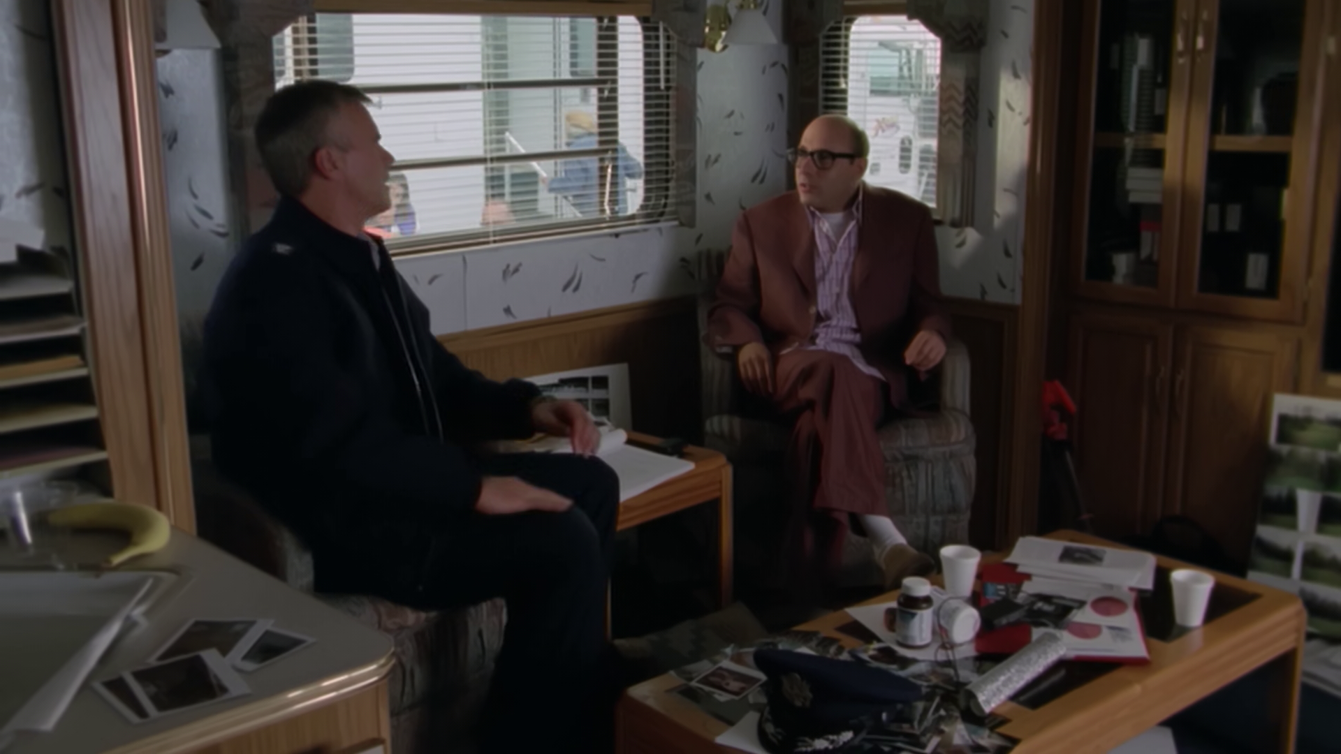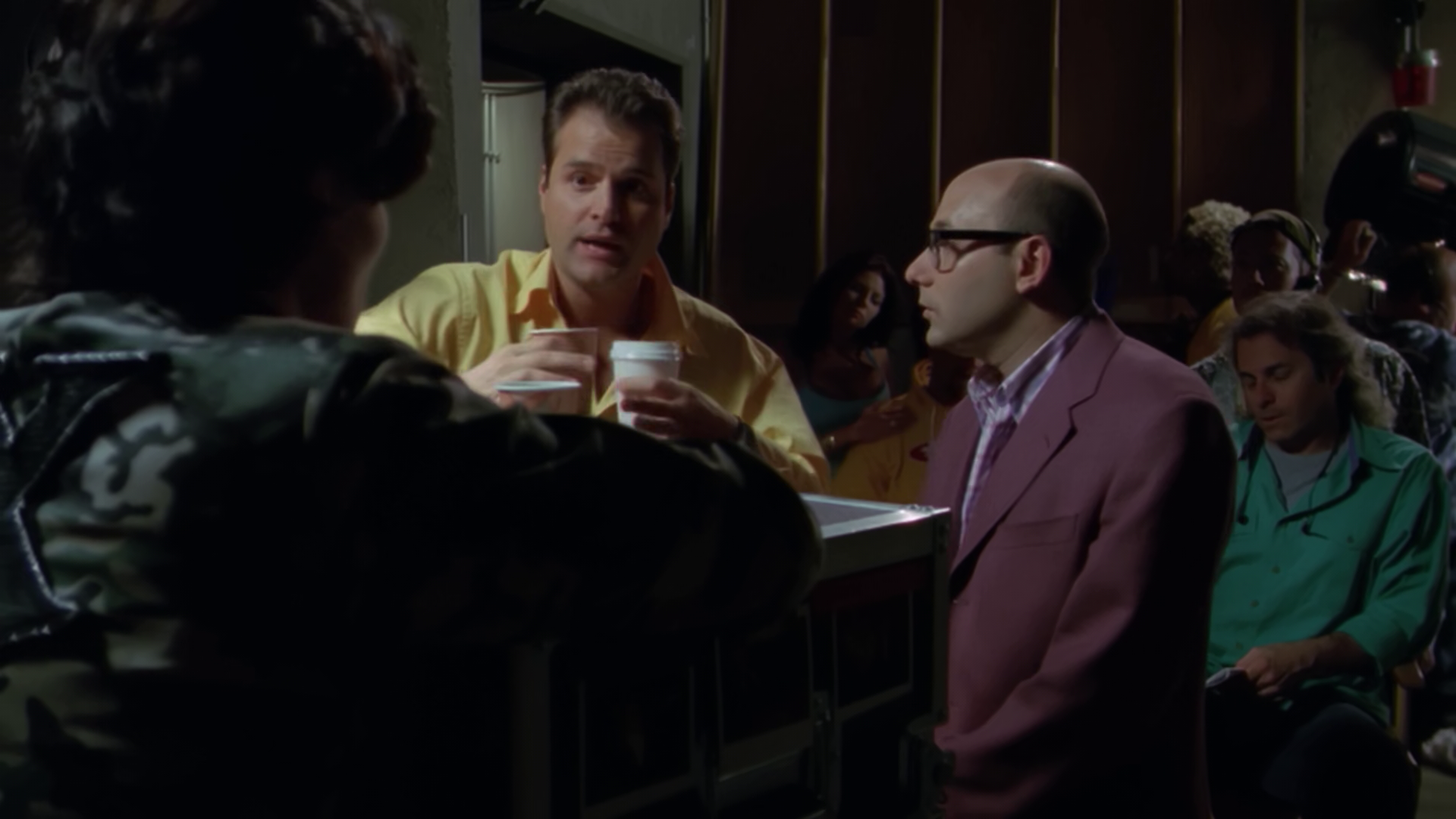 Hammond sends the rest of SG-1 to conduct surveillance to find out if Tanner is indeed back in the picture, and Fraiser confirms the use of mind. Carter’s equivalent from the show is asking questions about a scene. She’s supposed to be “out of phase” and can walk through walls and objects, but she’s confused as to why she doesn’t fall through the wall. Neither the director or Martin have an answer for her. Jack heads over to the craft services table and meets an undercover Teal’c (who is a chef again). He informs Jack that the investigation is still ongoing, although they do hack into the surveillance cameras.