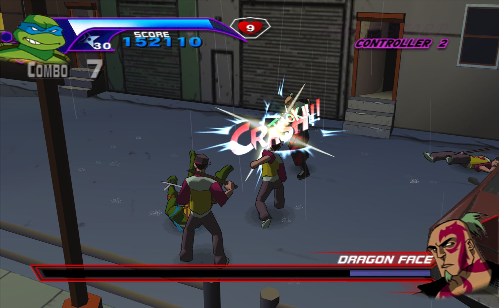 This is a tie-in game to the 2003 Ninja Turtles show. It’s a classic style arcade beat-’em-up from Konami – who made some great Ninja Turtle beat-’em-up arcade games – and was successful enough to get two sequels and a spin-off. It also starts out with the TV show intro and has the voice actors from it providing new lines. It all sounds rather promising.
