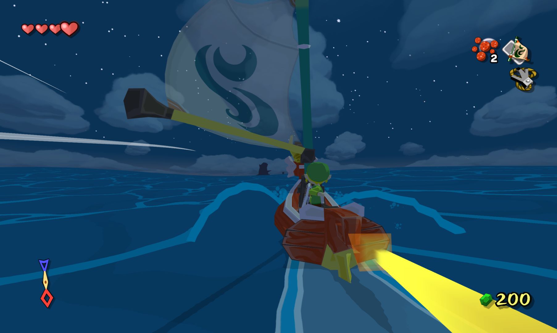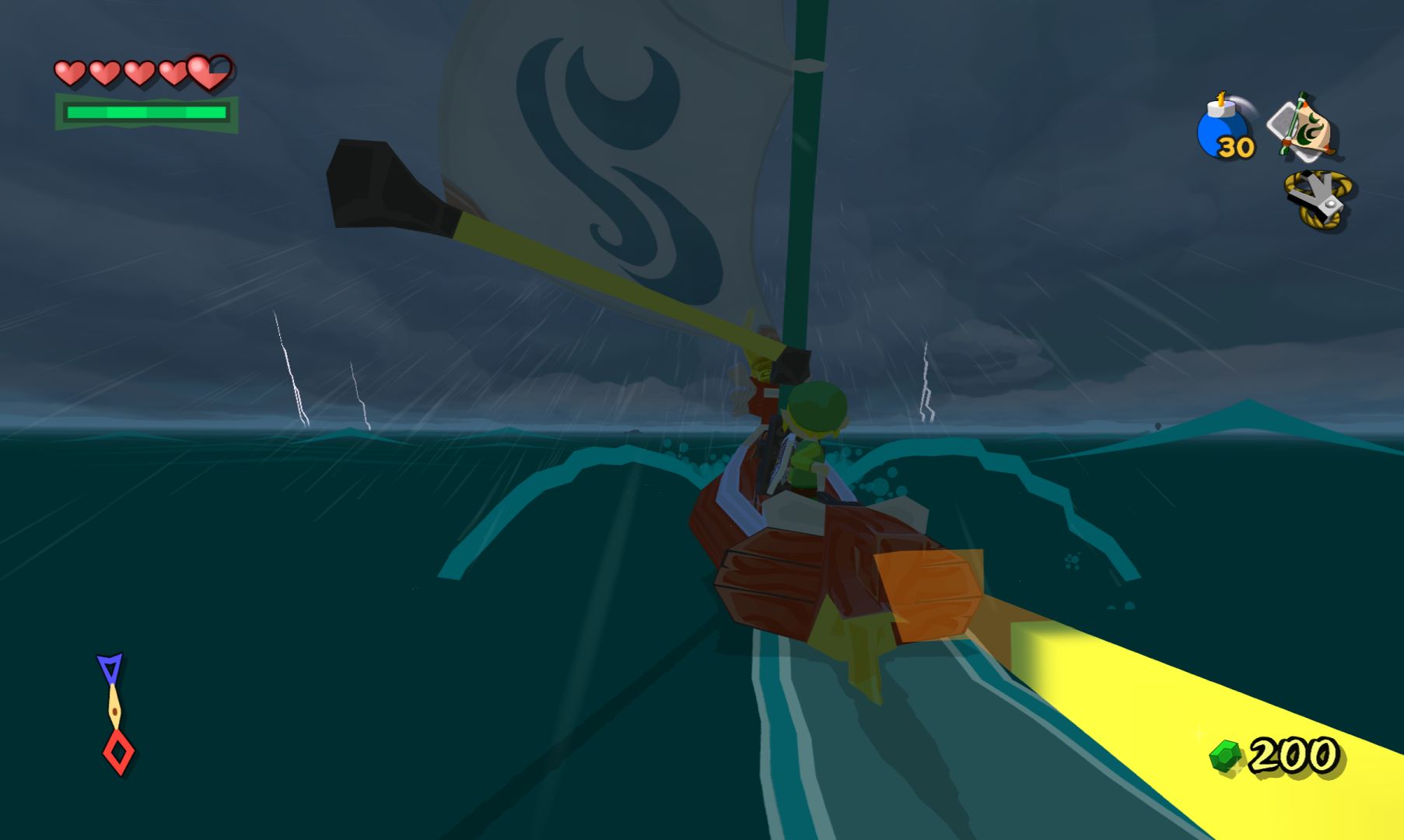 One thing I do love about Wind Waker are its items, and how they seem better utilised throughout the game, rather than forgotten about like some Zelda games can do. Part of this is due to how they can have multiple uses. The grappling hook is obtained from the first dungeon and can let you swing across gaps, but can also be used as a crane for grabbing chests when out at sea or to steal an item from an enemy, which can be helpful with side-quests. The one downside to this is you will need to pause the game to swap items a lot.