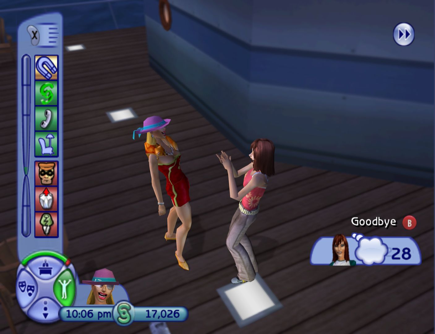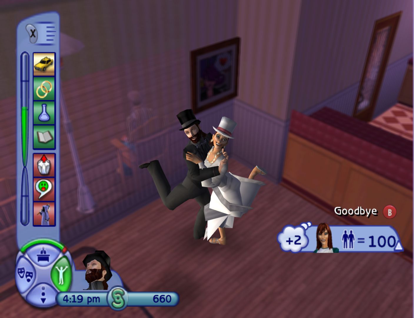 Sometimes, a la Nintendogs, The sims 2 tricks you into treating mathematically-controlled polygon models as living things. We were genuinely a bit miffed when our new bride reacted to our first kiss as a married couple by immediately running off for a dumb. Wearing her wedding dress, mark you. But, for the most part, this is a game too bogged down in the clumsy minutiae of bine-emptying, mail-opening and floor-mopping tedium to keep you happy enough with the illusion for long.