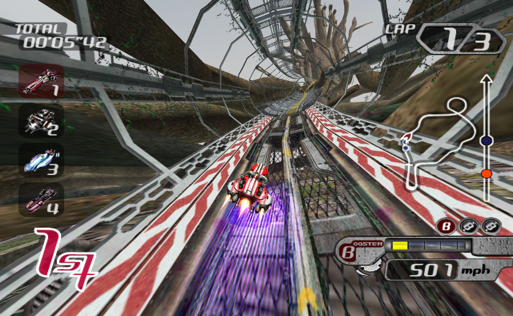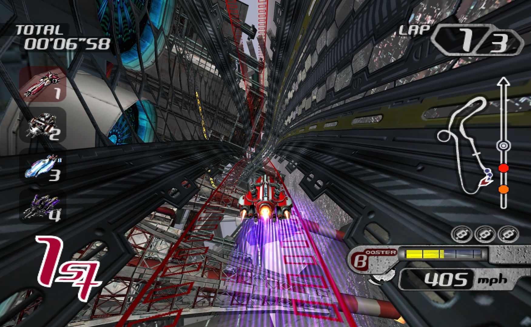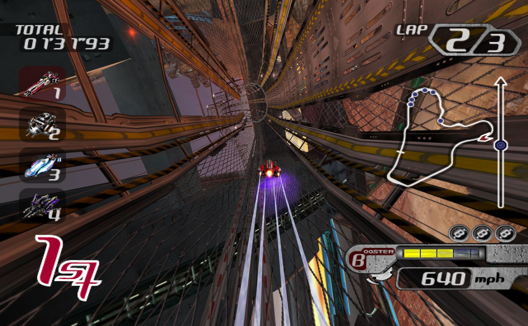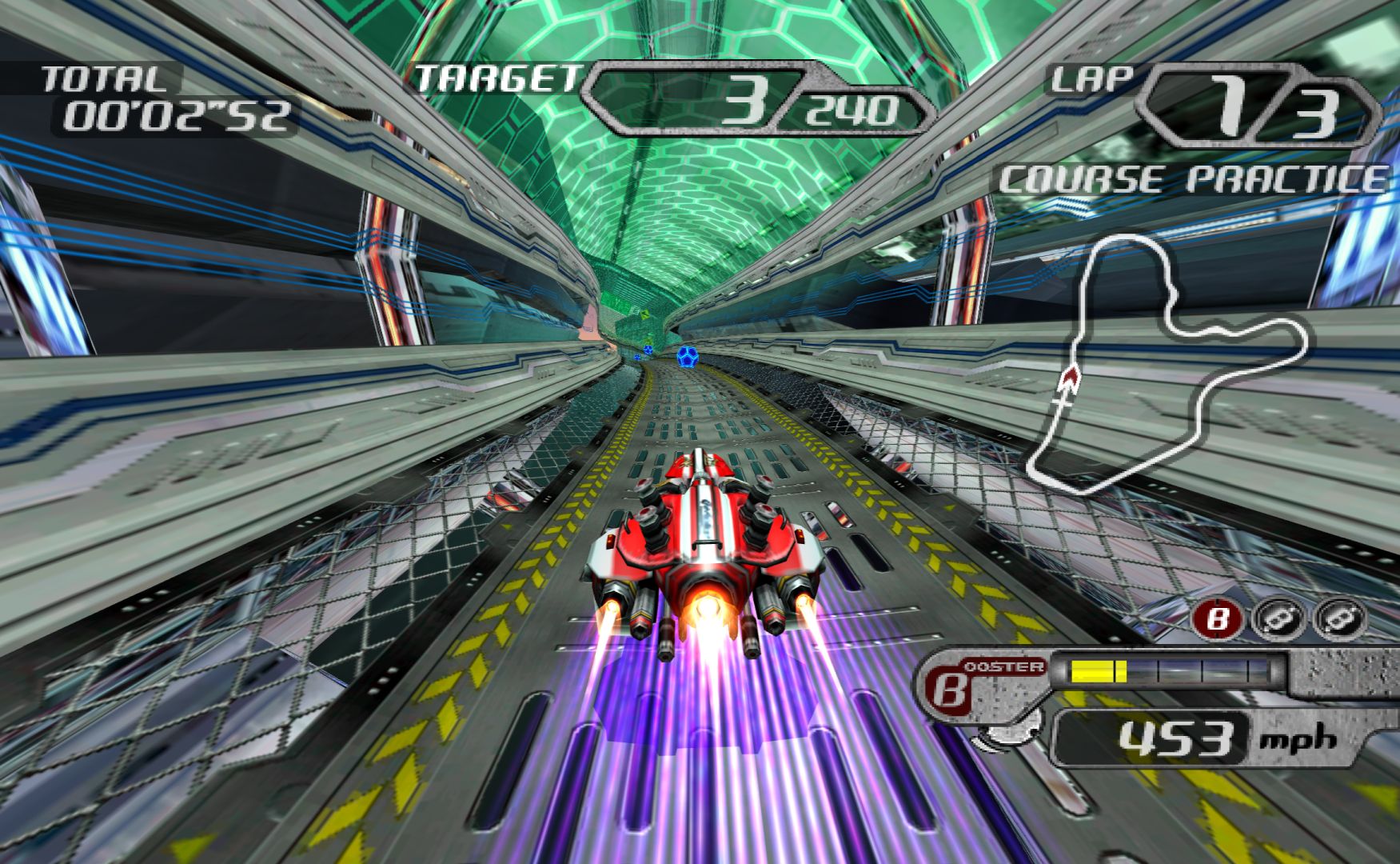 Tube Slider does some of its own things rather than just being an alternative take on F-Zero. Every level takes place inside a glass tube, which means you can’t fall off the track. In quite a contrast to F-Zero, you can’t die at all, with the game having a huge focus on its own boost system. There are two kinds of boost: one that banks one-use boosts, or one that lets you hold the boost button down so you can do some quick bursts.