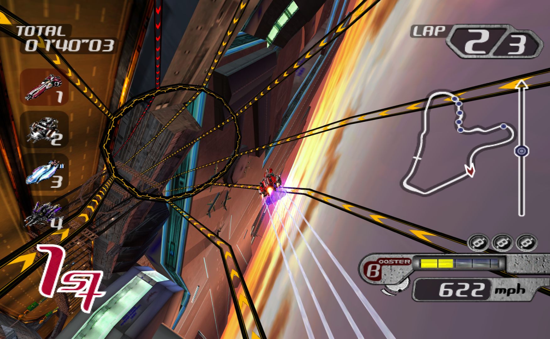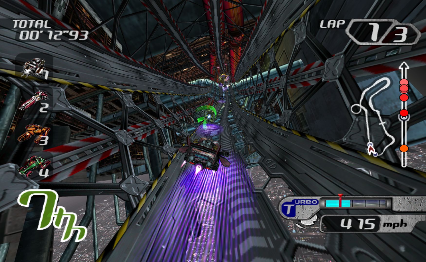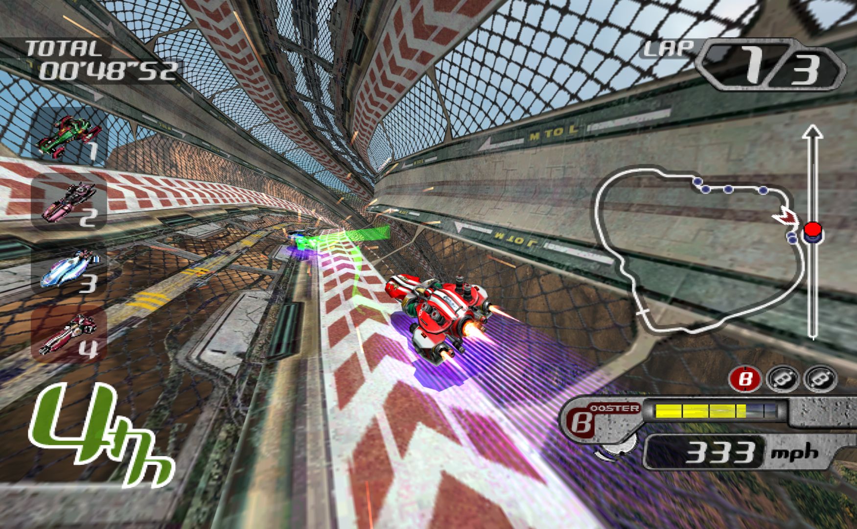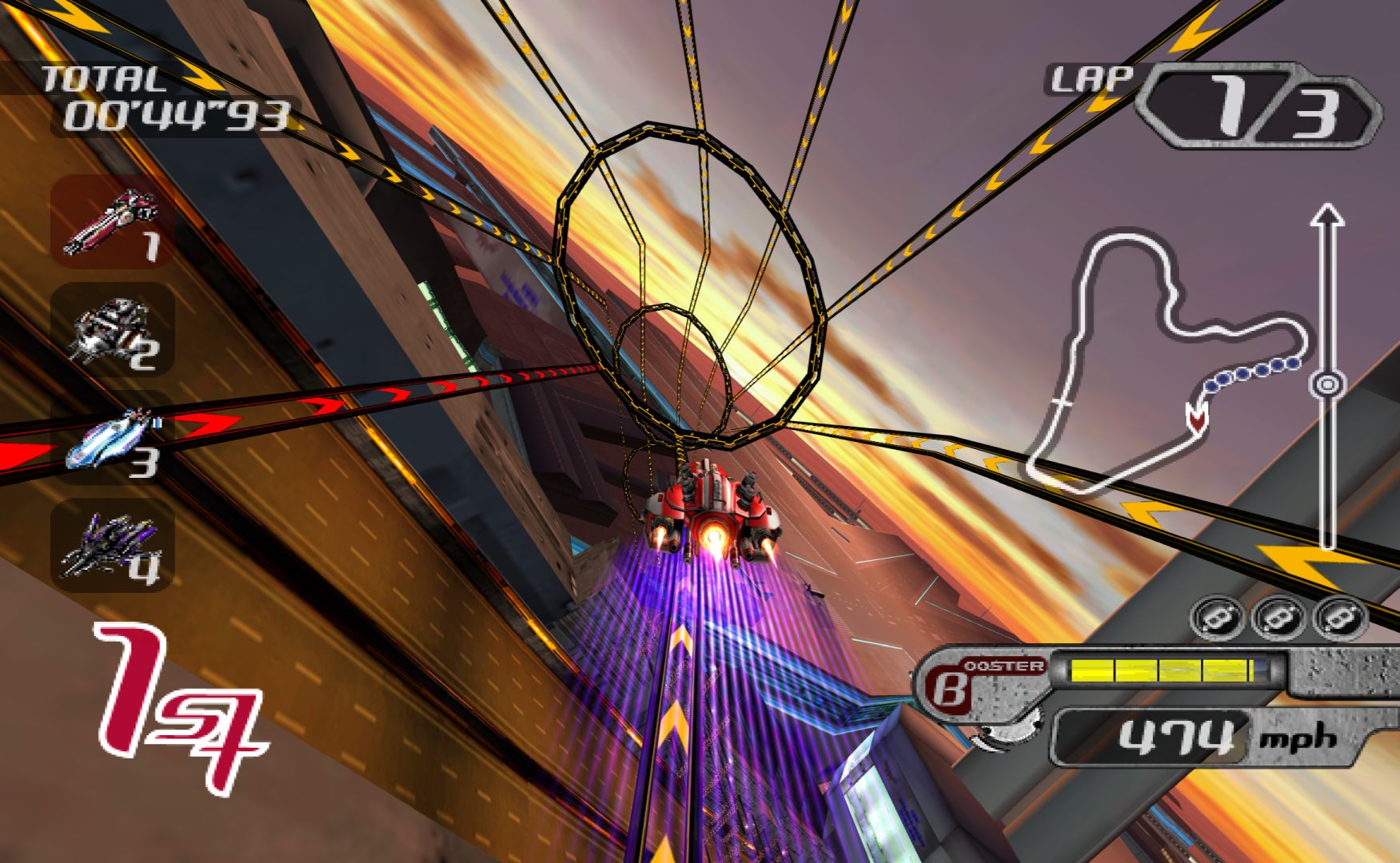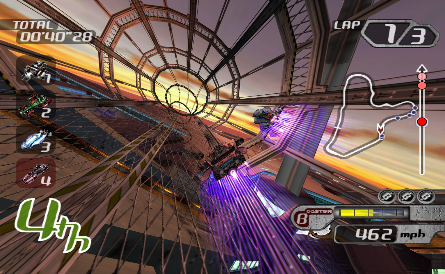 Tube Slider does some of its own things rather than just being an alternative take on F-Zero. Every level takes place inside a glass tube, which means you can’t fall off the track. In quite a contrast to F-Zero, you can’t die at all, with the game having a huge focus on its own boost system. There are two kinds of boost: one that banks one-use boosts, or one that lets you hold the boost button down so you can do some quick bursts.