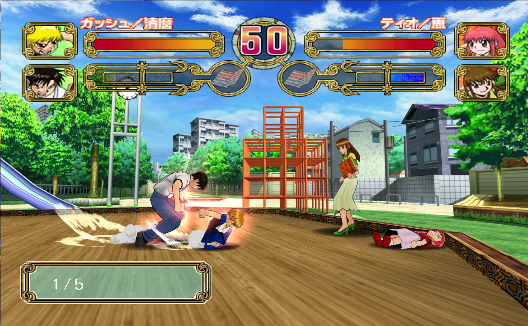 Zatch Bell is a anime about a competition that happens once every 1,000 years. 100 Demons descend upon Earth to compete in a battle to see who is best, however they need a human to command them via a spellbook in order to use their powers. These demons are mostly creatures that look like children, although there are a few more interesting looking ones. This is an enhanced version of the earlier PS2 Friendship Tag Battle.