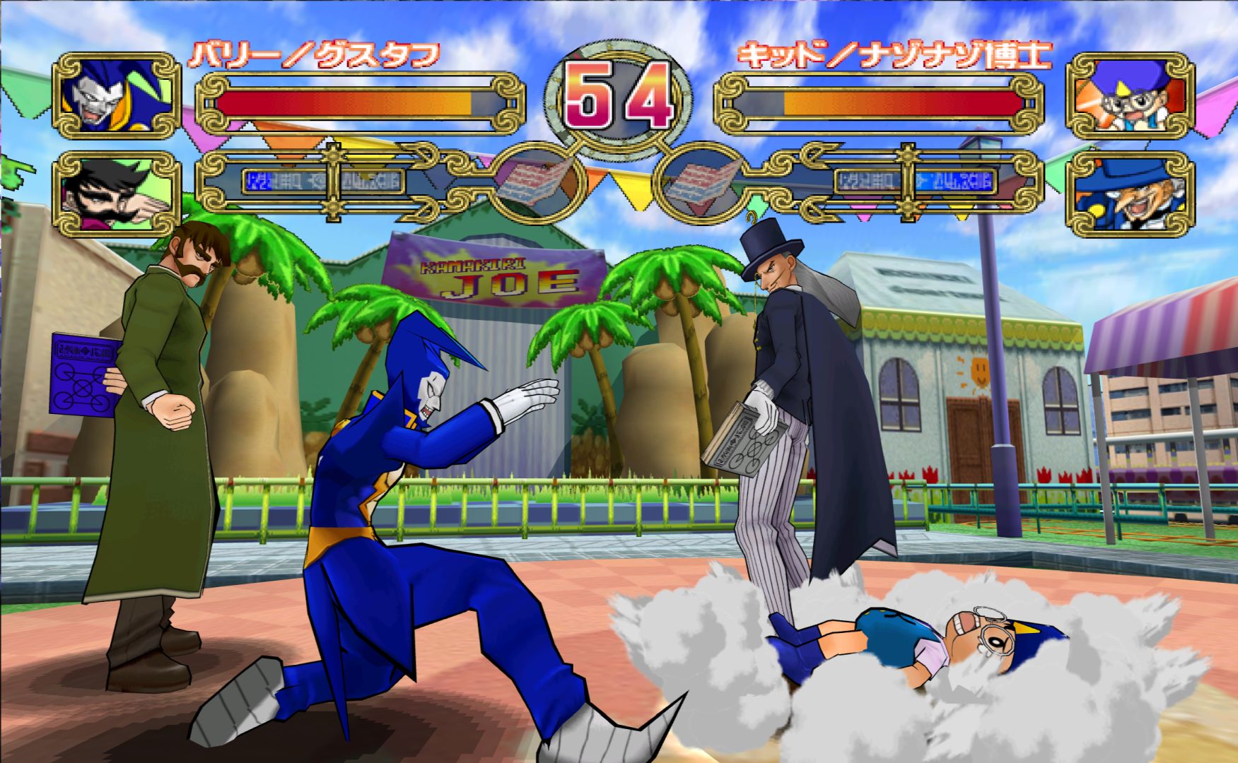 As it’s pretty much what the series is about, this is a 1-v-1 fighting game. Your demon (or Mamodo, which is just the Japanese word for demon, but wasn’t translated in the English version to avoid mentioning demons) can perform a variety of attack and the human controller can also step in to wallop the opponent’s demon (which does look a bit sketchy). You start off with 8 characters with a few more to unlock.